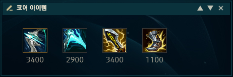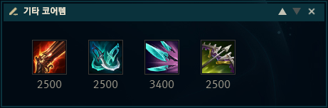 기타 코어 아이템으로 추천드리는 것은 고속 연사포, 유령 무희, 나보리 신속검, 필멸자의 운명입니다. 고속 연사포는 자야에게 필요한 공격 속도와 치명타 확률 증가를 모두 가지고 있는데다가 짧은 사거리를 지닌 자야에게 사거리 증가 효과는 굉장히 매력적입니다. Q-평타-E 콤보를 더 쉽게 맞출 수 있도록 도와주죠. 유령무희는 이동 속도와 공격 속도를 제공해주어 카이팅 능력을 향상시켜주고, 나보리 신속검의 경우는 공격력과 치명타, 높은 스킬 가속을 제공하기 때문에 스킬에 많이 의존하는 자야가 스킬을 더 자주 돌릴 수 있게 도와줍니다. 마지막으로 필멸자의 운명은 치유 감소가 필요할 때 처형인의 대검을 들고 사용하다 나중에 업그레이드 하는 아이템이죠.