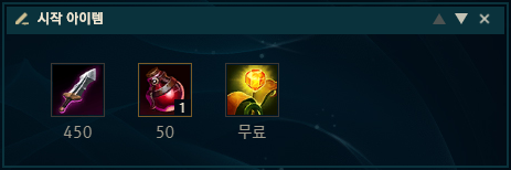 자야의 시작 아이템은 여타 원딜들과 마찬가지로 도란의 검으로 시작합니다. 초반 라인전에서 롱소드나 다른 아이템보다 효율이 굉장히 좋으며, 나중에 아이템을 팔면 되기에 도란의 검과 포션 1개로 시작합니다.