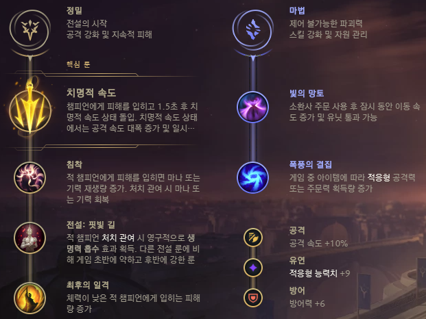 먼저 자야의 핵심 룬으로는 딜량도 높고 깃털 뿌리는 속도도 상승시키는 치명적 속도가 주로 선택됩니다. 하위 룬으로는 스킬을 많이 사용하는 챔피언으로 마나를 위한 침착, 라인 유지력을 올려주는 전설: 핏빛 길, 체력이 낮은 적을 공격할 때 데미지를 더 올려주는 최후의 일격을 들어줍니다. 보조 룬으로는 많은 다른 원딜들이 드는 것처럼 마법의 빛의 망토와 폭풍의 결집을 보편적으로 들어줍니다.