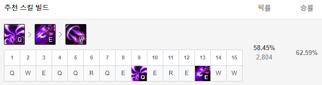 카이사의 스킬 빌드는 1레벨에는 Q를 찍어서 정글 리쉬를 도와주기도 하고 초반 미니언을 빠르게 정리해주기도 하며 2레벨에는 W를, 3레벨에는 E를 찍어주고 그 이후부터는 R-Q-E-W 순서로 스킬을 마스터해주면 되겠습니다.