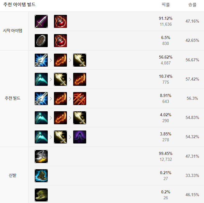 카이사는 스킬들을 자주자주 사용하는 챔피언인데요, 그만큼 마나무네가 잘 어울리는 챔피언이라 첫 코어 아이템으로는 마나무네를 올려준 뒤 광전사의 신발을 띄우고 그 다음에는 구인수의 격노검, 그리고 내셔의 이빨을 올려주는게 좋습니다.