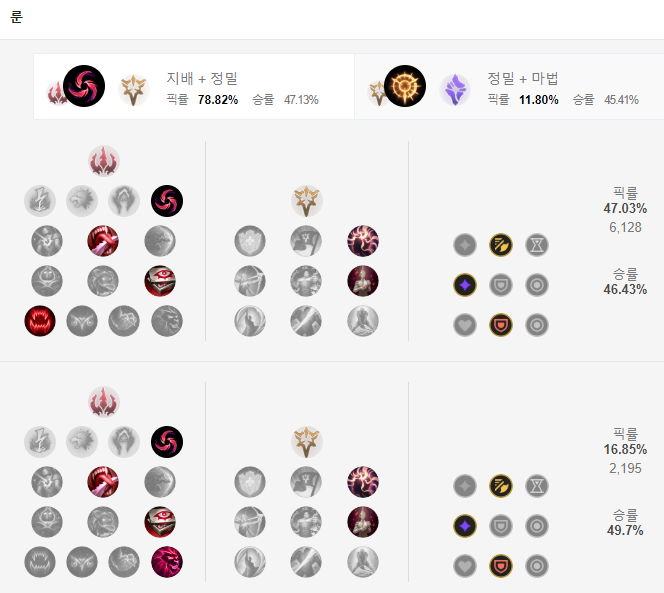 보조룬에는 정밀에 침착룬과 핏빛 길로 피흡량을 조금이라도 늘려서 생존에 도움이 되게 룬을 들어줍니다.