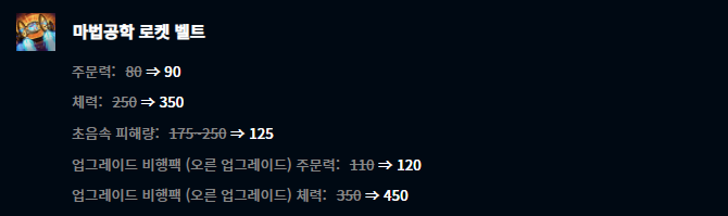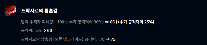 그 외에도 드락사르의 황혼검, 자객의 발톱, 마법공학 로켓 벨트, 밤의 수확자, 삼위일체, 선혈포식자, 발걸음 분쇄기와 같은 신화급 아이템들도 대체적으로 옵션이 조정되는 모습을 보여줬습니다.