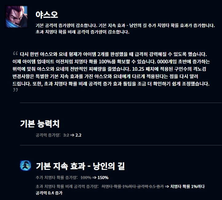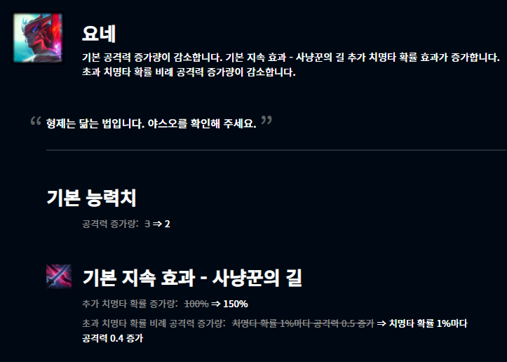 야스오와 요네는 추가 치명타 확률 증가량이 100%에서 150%로 증가했으며 초과 치명타 확률에 비례하여 올라가는 공격력이 치명타 확률 1%마다 0.4가 증가되게 감소되었습니다. 또한 기본 공격력 증가량이 3에서 2로 감소했죠. 과연 어떤 모습을 보여줄지 기대가 됩니다.