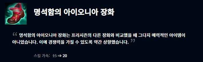 아이오니아 장화는 다른 장화들에 비해 크게 매력적인 포인트가 없었지만, 이번 패치로 스킬 가속이 15에서 20으로 증가하여 더 많은 챔피언들이 올리게 될 것이라 생각되네요.