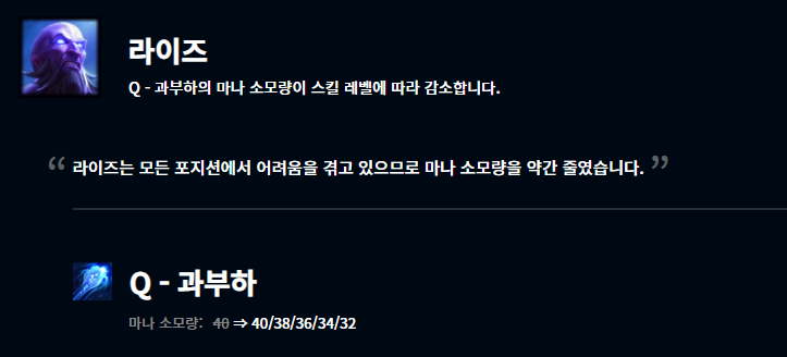 라이즈는 프리시즌으로 넘어오면서 영겁의 지팡이 아이템 삭제 및 신화급 아이템의 등장으로 템트리가 굉장히 꼬여버려서 굉장히 부진한 모습을 보여주고 있는 모습입니다. 마나 소모량을 감소시켰는데 이게 과연 그렇게 큰 도움이 될지는 잘 모르겠네요.