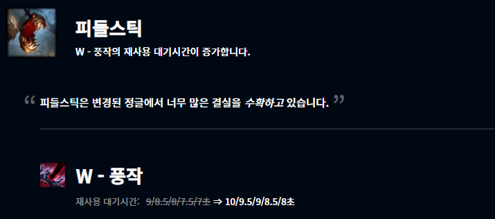 먼저 피들스틱은 W스킬의 재사용 대기시간이 증가하면서 너프를 당했습니다. 확실히 피들스틱은 53%가 넘는 높은 승률을 기록하고 있기도 하죠.