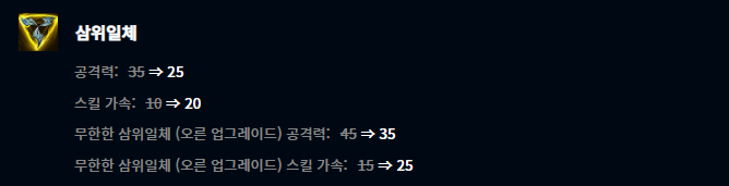 대천사의 지팡이는 아이템 조합식에서 사파이어 수정이 증폭의 고서로 변경되었고, 또한 마나 비례 주문력 증가량이 3%에서 2%로 감소했네요. 대천사의 지팡이 아이템 자체도 가는 챔피언이 그렇게 많지 않은데 추가 주문력 증가량까지 너프가 되면 결정적으로는 너프라고 생각이 드네요.