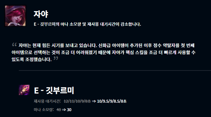 자야 역시 다른 원딜 챔피언들에 비해 아이템 관련 문제로 인하여 저조한 성적을 보이고 있죠. 스킬에도 많이 의존하는 원딜이라 정수 약탈자 아이템을 가야되는데 현재 대부분 메타가 신화급 아이템을 첫 코어로 가야하니 타 원딜들에 비해 밀리는 것이죠. E스킬 초반 재사용 대기시간와 마나 소모량을 감소했습니다.