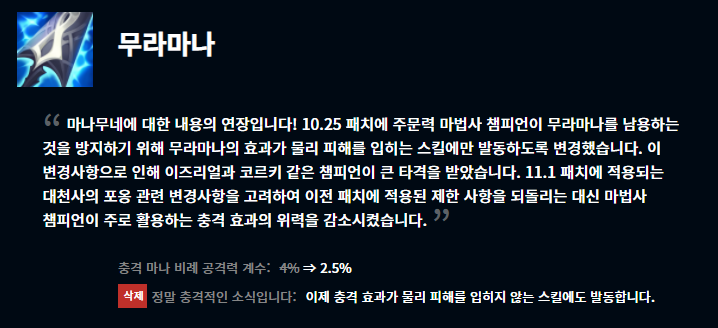 마나무네/무라마나는 항상 말이 많았었는데 이번 패치로 인해서 이즈리얼의 입지가 확실히 더 커질 것이라 생각이 듭니다. 이즈리얼은 W스킬, E스킬, R스킬도 다 마법 피해여서 무라마나의 효율을 Q로만 봤었는데 모든 스킬로 무라마나를 터뜨릴 수 있게 된 것이죠.