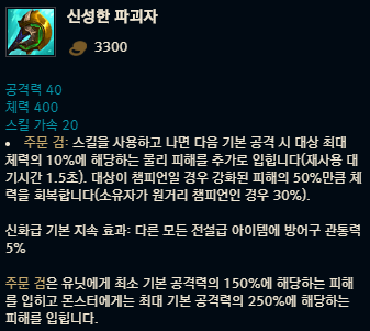 신성한 파괴자는 공격력 40, 체력 400, 스킬 가속 20이라는 옵션을 가지고 있습니다. 그리고 자체 효과로 주문 검 효과가 있는데요, 기본적으로 주문 검 효과는 많은 분들이 알고 있다시피 스킬을 사용한 뒤의 기본 공격에 추가 효과가 붙는 것이죠. 허나 주문 검 효과라고 다 똑같은 주문 검 효과가 아니라 각각 다른 모습을 보여주는데 이건 이따가 다루도록 하고 신성한 파괴자의 주문 검은 대상 최대 체력의 10%에 해당하는 물리 피해를 추가로 입히며, 대상이 챔피언인 경우 해당 피해의 50%만큼 체력을 회복하죠. 그리고 신화급 아이템 기본 지속 효과로 다른 모든 전설급 아이템에 방어구 관통력을 5%씩 부과합니다.