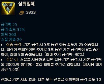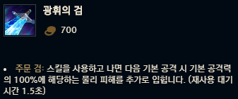 광휘의 검, 신성한 파괴자, 삼위일체 모두 보면 주문 검 효과를 가지고 있지만 아이템마다 주문 검 효과는 조금씩 상이합니다. 가장 기본이 되는 광휘의 검의 주문검의 효과는 스킬 사용 후 다음 기본 공격 시 기본 공격력의 100%에 해당하는 물리 피해를 추가로 입히며, 삼위일체의 주문 검은 스킬을 사용하고 나면 다음 기본 공격 시 기본 공격의 200%에 해당하는 물리 피해를 추가로 입히고, 신성한 파괴자의 주문 검은 스킬을 사용하고 나면 다음 기본 공격 시 대상 최대 체력의 10%에 해당하는 물리 피해를 추가로 입히고 대상이 챔피언인 경우 해당 피해의 50%만큼 체력을 회복하죠. 뭐 이 이외에도 남아있는 주문 검 효과가 있는 아이템인 리치베인과 정수 약탈자도 각각 주문 검 옵션이 조금씩 다릅니다. 주문 검이라고 다 같은 주문 검이 아니라는 사실, 아시겠죠?