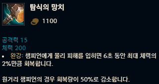 신성한 파괴자의 하위 아이템은 탐식의 망치, 광휘의 검, 점화석입니다. 탐식의 망치는 공격력 15와 체력 200을 증가시키며 챔피언에게 물리 피해를 입히면 6초동안 최대 체력의 2%만큼 체력을 회복하죠. 점화석의 경우는 체력 200에 스킬가속 10이라는 효과를 가지고 있구요. 또 광휘의 검은 스탯 옵션은 없지만 아이템 효과로 스킬 사용 후 기본 공격시 공격력에 100%에 해당하는 물리 피해를 추가로 입히죠. 이렇게 세 아이템과 추가 골드를 조합하여 신성한 파괴자 아이템을 구매할 수 있습니다.