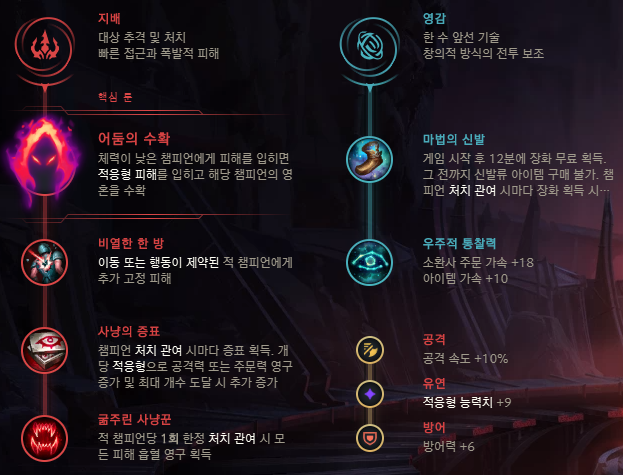 시즌11 릴리아는 보통 지배 탭의 어둠의 수확을 주로 사용합니다. 패시브 도트딜로 인하여 수확을 쌓기 쉽기 때문인데요, 하위 룬으로는 비열한 한 방, 시야 수집, 굶주린 사냥꾼을 채용합니다. 보조 룬으로는 영감의 마법의 신발과 우주적 통찰력을 들어주죠.
