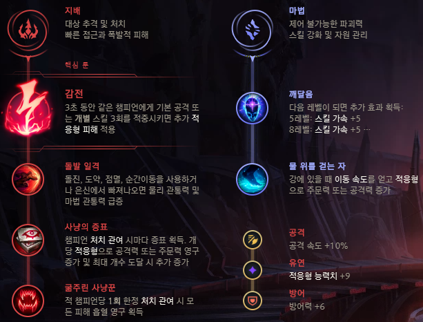 니달리의 핵심 룬은 지배의 감전과 어둠의 수확으로 나뉘는데요, 어둠의 수확을 드는 경우는 후반에 더욱 강력한 룬이고 감전은 초반에 더 강한 룬입니다. 최근 추세는 어둠의 수확보다 감전을 많이 들어줍니다. 하위 룬으로는 돌발 일격, 사냥의 증표, 굶주린 사냥꾼을 보편적으로 들어주며, 보조 룬은 마법에서 스킬 가속을 올려주는 깨달음과 강에 있을 때 추가 이동 속도를 제공하는 물 위를 걷는 자를 들어줍니다.