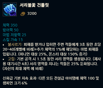 서리불꽃 건틀릿은 체력 350, 방어력 50, 마법 저항력 25, 스킬 가속 15라는 옵션을 가지고 있습니다. 거기에 자체 효과로 불사르기 효과가 있어서 피해를 받거나 입히면 주변 적들에게 초당 마법피해를 입히고, 고립이라는 효과가 있는데 과거 얼어붙은 건틀릿의 역장 효과라고 보면 되겠습니다. 기존 얼어붙은 건틀릿과 비교해보자면 역장의 크기와 둔화율이 대폭 증가하였으며 또 그냥 기본 공격만 해도 역장이 생성됩니다. 신화급 기본 지속 효과로 다른 모든 전설급 아이템에 체력 100을 올려주고, 챔피언의 크기가 6%씩 늘어나는데요, 챔피언의 크기가 늘어나는 것에 대해 적 스킬에 맞기 더 쉽다는 단점이 있습니다.