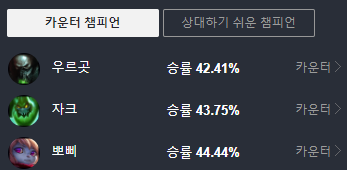 우르곳의 경우 초반부터 원거리 공격으로 나서스를 괴롭힐 수 있고, 티모같은 경우도 정글 갱킹이 없는 경우 티모가 조금만 할 줄 안다면 실명으로 스택을 못쌓게 방해하고 평타로 괴롭히면서 농락당할 수 있습니다. 자크같은 경우에는 갱호응이 너무 좋아 갱을 쉽게 당할 위험이 있어서 카운터 챔피언입니다.