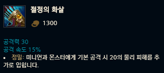 돌풍의 하위 아이템으로는 절정의 화살, 민첩성의 망토, 곡괭이가 있습니다. 보통 원딜들이 첫 귀환에서 절정의 화살을 뽑아가는 경우가 많은데, 절정에 화살에는 미니언과 몬스터에게 기본 공격 시 20의 물리 피해를 추가로 입히기에 파밍이 더 수월해지기 때문이죠.