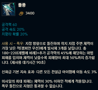 돌풍은 우선 공격력 60, 공격 속도 20%, 치명타 확률 20%의 옵션을 가지고 있으며, 사용 시 폭우라고, 지정 방향으로 돌진하여 착지 지점 주변 체력이 가장 낮은 적(챔피언 우선)에게 발사체 3개를 날립니다. 총 180~220(레벨 비례)+추가 공격력의 45%에 해당하는 마법 피해를 입히며 체력이 낮을수록 피해량이 최대 50%까지 증가하죠. 또 신화급 기본 지속 효과로 다른 모든 전설급 아이템에 이동 속도 3%를 부여합니다. 전설 아이템이 나올수록 기동력도 더 빨라지고, 거기에 회피기 및 추노기, 막타용 등 다양하게 사용할 수 있는 사용 효과로 많은 원딜들에게 사랑받고 있죠.