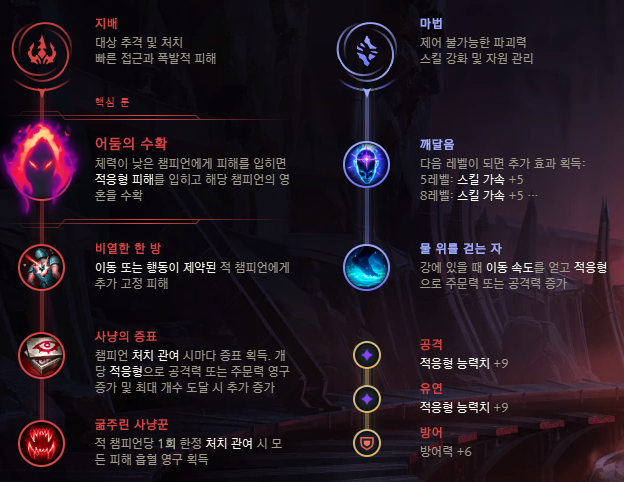 모르가나는 주 룬으로 어둠의 수확을 주로 사용합니다. 여러 라인을 다니면서 Q스킬 맞추기를 노력하여 갱을 시도하고 갱이 실패하더라도 상대방 피가 없는 경우 W스킬을 통해 손쉽게 수확 스택을 쌓을 수 있기 때문이죠. 하위 룬으로는 Q스킬을 맞았을 때 및 궁극기 속박이 적중했을때 데미지를 올려주는 비열한 한 방과 무난한 사냥의 증표, 그리고 흡혈량을 올려주는 굶주린 사냥꾼을 들어주면 됩니다. 보조 룬에는 마법의 스킬 가속을 올려주는 깨달음, 강가에서 이동 속도가 빨라지는 물 위를 걷는 자를 들어주면 되겠습니다.