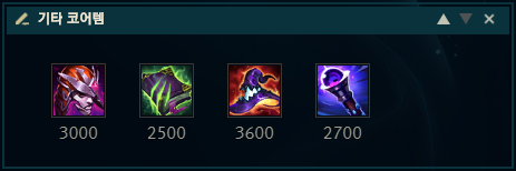 기타 코어 아이템으로는 악마의 포옹, 모렐로노미콘, 라바돈의 죽음 모자, 공허의 지팡이 정도가 있겠네요. 악마의 포옹같은 경우는 리안드리의 고뇌와 더불어 모르가나의 W스킬 딜링을 한 층 더 업그레이드 시켜줍니다. 모렐로노미콘은 상대방에 블라디, 아트록스, 문도, 소라카 등의 회복 및 흡혈이 강력한 챔피언이 있을 때 올려주면 좋습니다. 공허의 지팡이는 상대방이 마법 저항력 아이템을 너무 많이 올렸을 때, 라바돈의 죽음 모자는 그냥 딜링으로 찍어 누르고 싶을 때 올려주면 되겠습니다.