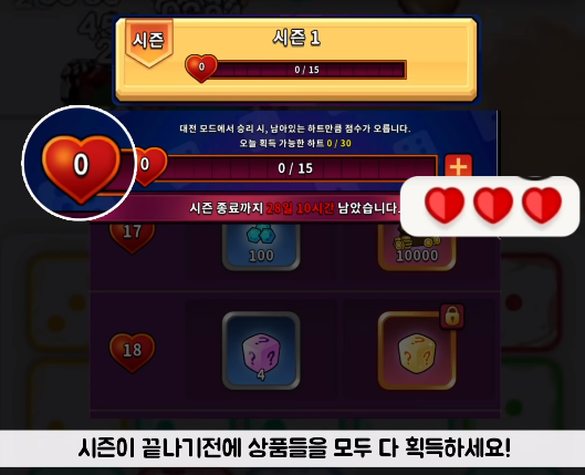 또한 시즌패스란게 등장했습니다. 이 시즌패스는 기존 클래스를 올리면 받을 수 있는 트로피 보상과 비슷한 형식인데요, 대전 모드에서 승리한 경우 본인의 남아있는 하트가 시즌패스의 재료가 됩니다. 트로피 보상과 마찬가지로 현질을 하면 추가 보상을 획득할 수 있게 됩니다.