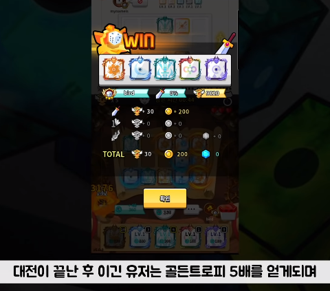 자신과 상대방중 낮은 베팅이 채택되는데요, 예를 들어 본인은 2장, 상대는 3장을 베팅한 경우 2장으로 베팅이 되고 해당 경기에서 승리시 트로피 5배를 얻게 되고 패배하는 경우 5배를 잃게 됩니다.