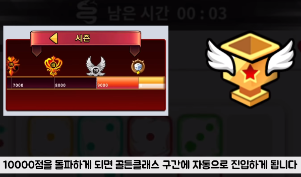 시즌제가 도입되었다고 해서 전적이 초기화되는 것은 아니며 업데이트 전 점수에 맞게끔 점수가 조정이 되어 클래스는 유지되고, 또 9천점을 넘었었던 사람은 그에 맞게 엠블렘과 주사위 원석, 다이아 등 보상이 주어집니다.