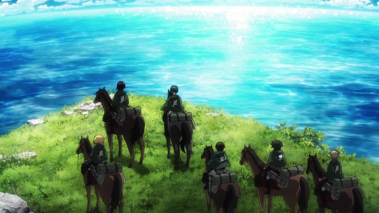 그 이후 에렌과 조사병단은 구멍을 막기 위해, 또 에렌의 과거 지하실에 있다는 이 세계의 비밀을 밝히기 위해 임무를 수행합니다. 그 과정에서 구멍은 성공적으로 막았으나 그 이후 짐승 거인, 갑옷 거인, 초대형 거인이 등장해서 조사병단을 박살내죠. 특히 짐승 거인은 저 멀리서 바위를 손으로 으깨서 조사병단쪽으로 던지는데 이로 인해 굉장히 큰 피해를 입게 됩니다. 이러한 피해에 조사병단 단장 엘빈은 본인을 포함한 남은 병사들을 미끼로 하고 리바이로 하여금 짐승 거인을 무찌를 작전을 짭니다.
