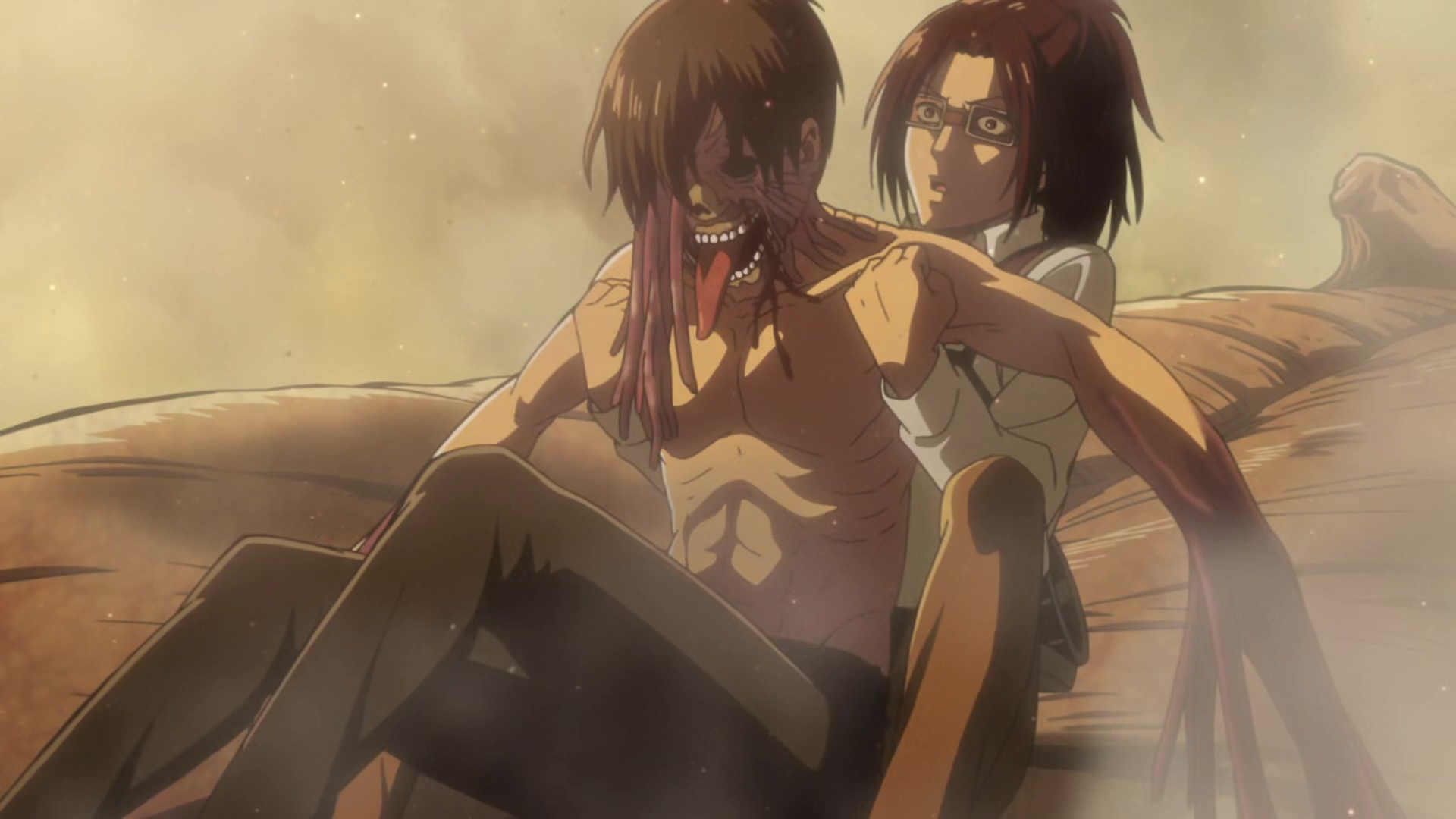 또 한편 다른 곳에서도 새로운 떡밥이 주어지는데 또 다른 동기생이었던 유미르도 사실 거인화를 할 수 있었던 것이었죠. 그녀는 궁지에 몰린 동기생들을 거인으로 변해서 구하는 모습을 보여줍니다. 또 유미르가 친하게 지냈던 크리스타 렌즈가 본명이 사실 히스토리아고 숨겨진 귀족의 혈연이었는데 혈족간의 권력다툼으로 인해 신분을 숨기고 병사단에 입단했다는게 드러나죠.