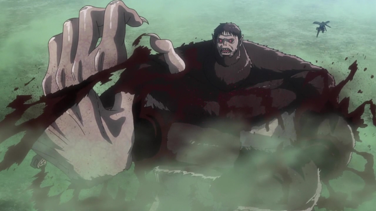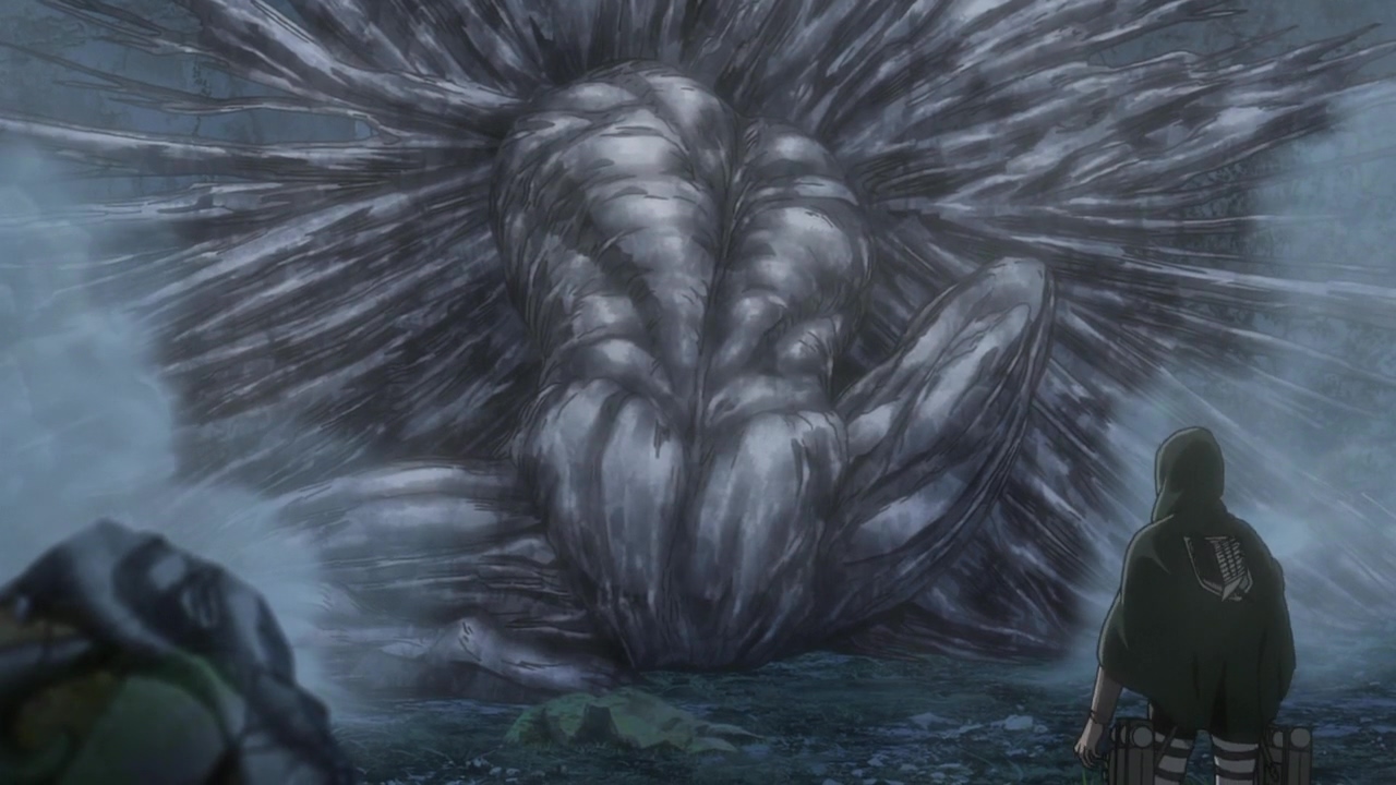 그 이후 에렌과 조사병단은 구멍을 막기 위해, 또 에렌의 과거 지하실에 있다는 이 세계의 비밀을 밝히기 위해 임무를 수행합니다. 그 과정에서 구멍은 성공적으로 막았으나 그 이후 짐승 거인, 갑옷 거인, 초대형 거인이 등장해서 조사병단을 박살내죠. 특히 짐승 거인은 저 멀리서 바위를 손으로 으깨서 조사병단쪽으로 던지는데 이로 인해 굉장히 큰 피해를 입게 됩니다. 이러한 피해에 조사병단 단장 엘빈은 본인을 포함한 남은 병사들을 미끼로 하고 리바이로 하여금 짐승 거인을 무찌를 작전을 짭니다.