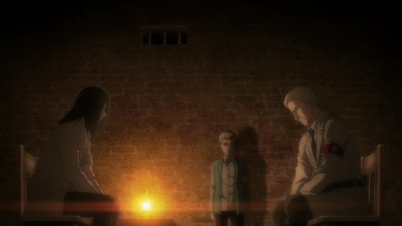 여하튼 마레에서 다른 국가들과 전쟁 등 임무를 수행하며 살아가고 있던 라이너에게 에렌이 나타나고, 그들은 대화를 나눕니다. 에렌은 라이너에게 과거 섬의 방벽을 부셔서 비극을 가져온 일을 "어쩔 수 없었던 일"이라 합니다. 또 "나도 너와 똑같다"라는 말로 본인도 어쩔 수 없이 본인이 자란 섬과 동기들, 주민들을 지키기 위한다고 거인이 되어 마레인들에게 큰 피해를 입히죠. 이에 조사병단들도 가세하죠.