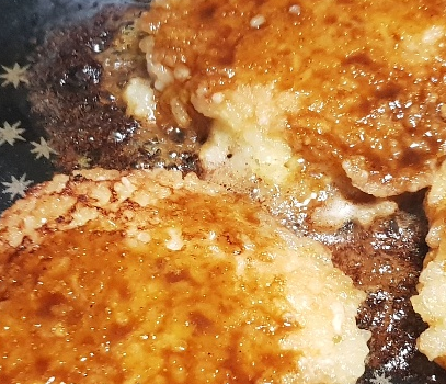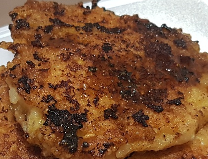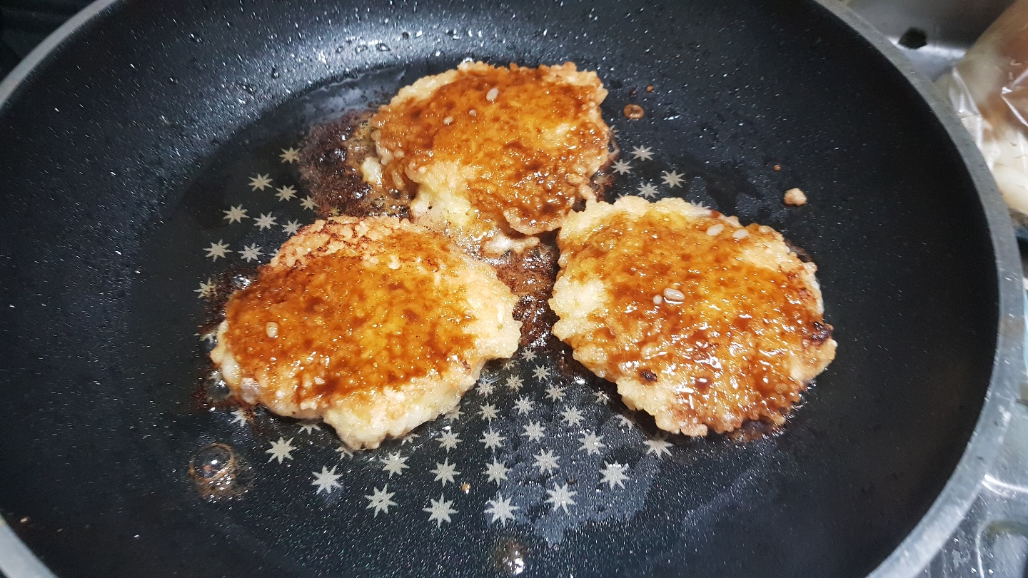 불을 중불에 놓고 어느정도 프라이팬이 달궈졌다 싶으면 아까 만들어놓은 밥을 숟가락을 이용하여 적당히 한뭉텅이씩 올려놓습니다. 치이이이익 하는 소리와 함께 잘 구워집니다. 3분정도 구워주다가 한번 뒤집어주니 노릇노릇하게 잘 구워진 것 같습니다.