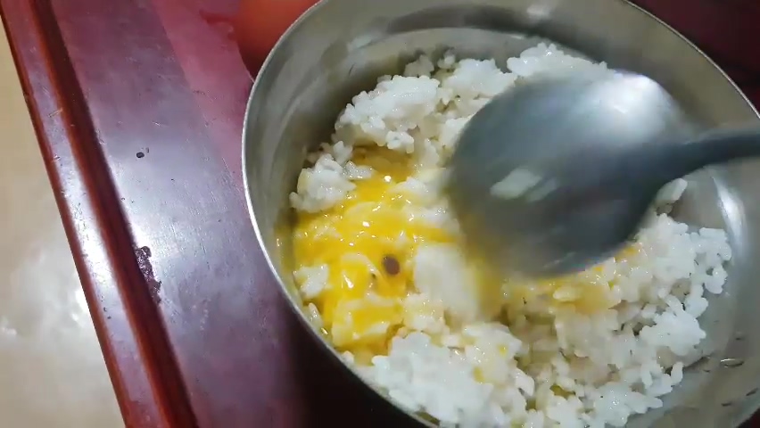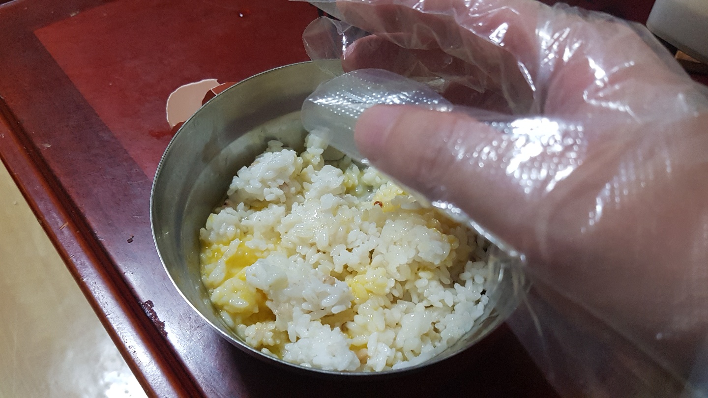 투하해준 계란이 밥과 잘 섞이게 숟가락으로 비벼줬습니다만, 생각외로 힘들었습니다. 밥이 냉장고에 있던 밥을 데우지도 않았기에 밥이 굉장히 뭉쳐있었기 때문이죠. 조금 비벼주다가 이대로는 안되겠다 싶어서 그냥 비닐장갑을 꺼냈습니다.