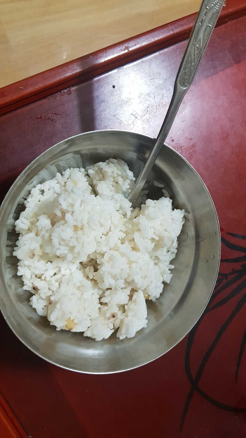 잘 섞인 밥에 맛소금을 한꼬접 투하해줬습니다. 그나저나 맛소금의 유통기한이 지났습니다. 뭐 평소 요리를 잘 안해먹기 때문에 그런 것 같습니다만, 어차피 먹어도 죽지 않는다는 마인드로 그냥 사용했습니다. 그러면 이제 밥은 준비가 끝났습니다.