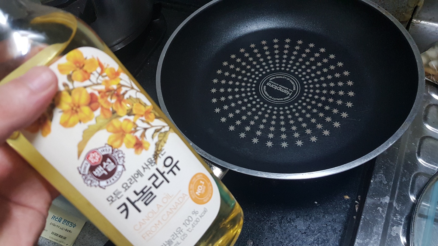 후라이팬에 식용유를 적당히 두릅니다. 사실 적당히라는 표현이 굉장히 애매하긴 한데 저같은 경우는 붓고 팬을 이리저리 움직였을 때 팬 전체가 충분히 식용유로 코팅이 되는 정도로 부었습니다. 계속해서 강조하지만 특별한 레시피가 있는게 아니라 그냥 몸 가는대로 만든 실험적 요리이기 때문이죠.