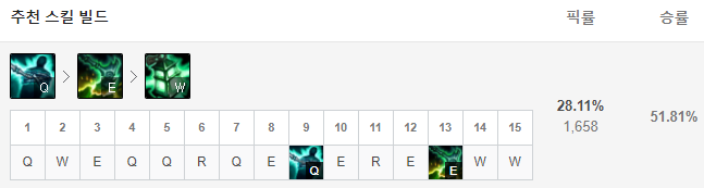 칼바람 나락의 쓰레쉬는 Q스킬, E스킬, W스킬 순서로 스킬을 마스터합니다. 당연하게 궁극기를 찍어야 되는 레벨엔 궁극기를 찍어주는게 맞죠. R-Q-E-W 순서로 스킬을 마스터한다고 할 수 있겠네요. Q스킬은 찍으면 찍을수록 쿨타임이 감소하기 때문에 더 자주 상대방을 노릴 수 있게 됩니다.