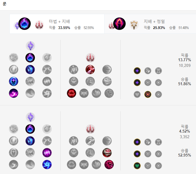 하이머딩거의 룬은 마법의 유성이 제일 효율이 좋은데요, 그 이유는 포탑의 공격에도 룬이 적용되기 때문입니다. 포탑이 적 챔피언을 때렸을 때 유성이 쿨타임이 아니라면 터져서 좋죠. 하위 룬으로는 마나순환 팔찌, 깨달음, 주문 작열을 들어주시고 보조 룬으로는 체력 관리를 위한 피의 맛과 굶주린 사냥꾼을 들어주시면 됩니다.