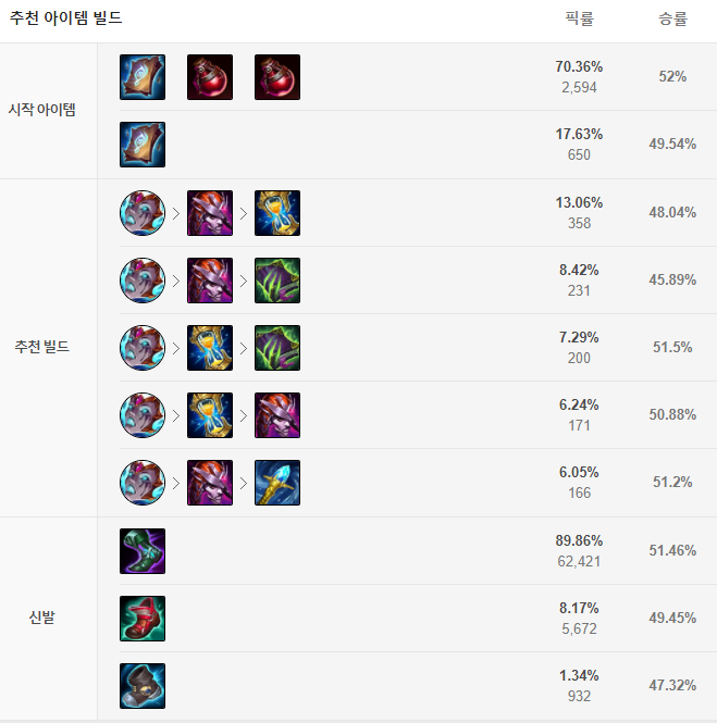 하이머딩거 포탑 한 두대는 별로 아프지 않다는 느낌이 있습니다. 하지만 리안드리의 고뇌와 악마의 포옹을 올리게 된다면 한 번만 맞아도 체력비례 도트뎀이 들어가기 때문에 큰 효율을 볼 수 있죠. 또 W스킬 역시 고의로 더 넓게 퍼지게 쏴서 한 방이라도 맞으면 도트뎀을 넣어줄 수 있습니다. 시작 아이템은 양피지에 포션 두개로 가주시고, 이후 리안드리의 고뇌, 악마의 포옹, 라일라이의 수정홀 이렇게 가는게 제일 좋습니다. 신발은 보통 1~2코어를 띄운 뒤 마관신을 올려주시면 됩니다.
