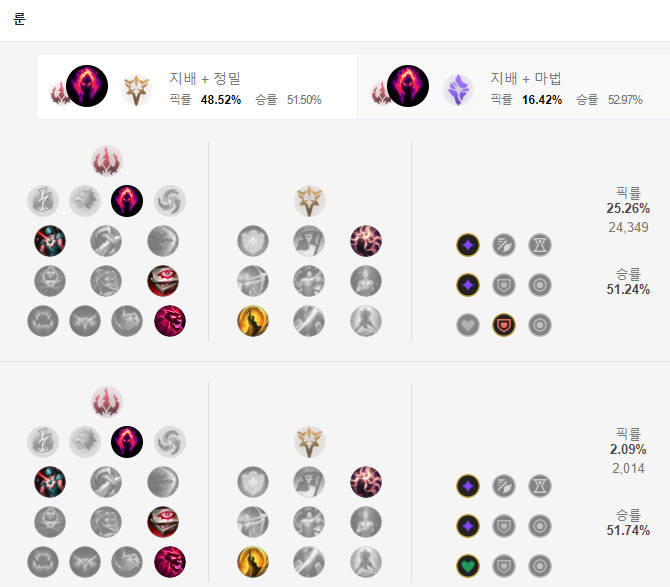 니코는 후반으로 가면 갈수록, 스택을 많이 쌓으면 쌓을수록 좋은 어둠의 수확을 들어줍니다. 하위 룬으로는 비열한 한방, 시야 수집, 궁극의 사냥꾼을 들어주시고 보조룬에는 침착과 최후의 일격을 들어주는게 제일 보편적인 선택이죠.