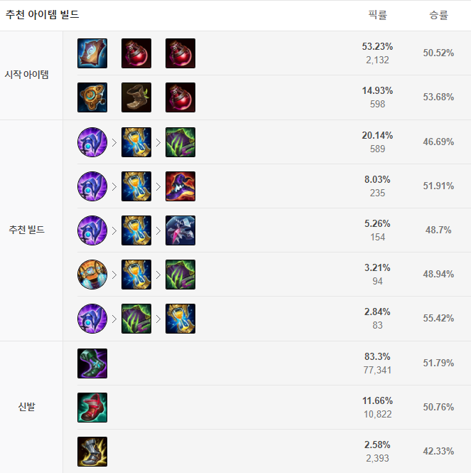 시작은 사라진 양피지와 포션 두개로 시작해줍니다. 첫 코어 아이템으로 루덴의 메아리를 올려주시고 두 번째 코어 아이템으로는 존야의 모래시계를 올려줍니다. 중간에 돈이 애매하게 남는 경우 마법사의 신발을 올려주시구요. 그 이후에는 상대방에 피흡, 회복이 강한 챔피언이 있는 경우 모렐로노미콘, 그 외의 경우에는 라바돈의 죽음 모자를 올려주시는게 좋습니다.