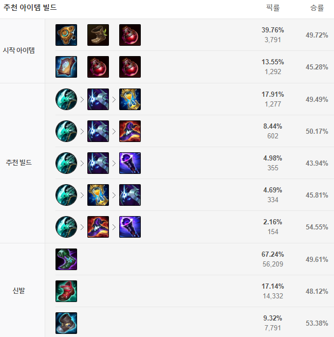 칼바람 말파이트는 처음에도 말했다시피 탱커용 아이템보다는 AP 아이템을 올려 딜러 포지션을 취합니다. 그렇기 때문에 첫 번째 코어 아이템으로는 밤의 수확자, 두 번째 아이템은 우주의 추진력, 세 번째 아이템은 존야의 모래시계를 올려주는게 보통입니다. 신발은 보통 첫 번째 코어 아이템을 띄워준 이후 마법사의 신발을 올려주고 이후 아이템은 상황을 보고 알맞게 공허의 지팡이, 라바돈의 죽음 모자 등을 올려주시면 됩니다.