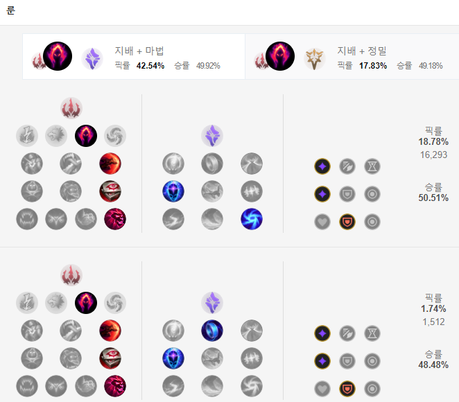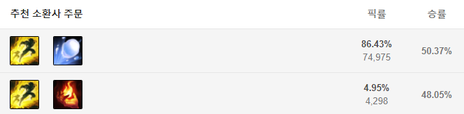 후반으로 가면 갈수록 효율이 좋은 어둠의 수확 룬을 메인으로 사용하고 하위 룬으로는 무난한 시야수집과 궁극기와 잘 맞는 돌발일격, 궁극의 사냥꾼을 들어주면 됩니다. 보조 룬으로는 초반 부족한 마나를 보조하기 위한 마나순환 팔찌와 스킬 쿨타임을 감소시켜주는 깨달음을 올려주시면 됩니다.