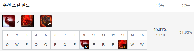 스킬 빌드같은 경우는 R-Q-E-W 순서로 스킬을 마스터해주시면 됩니다. Q스킬은 딜이 어느정도 쏠쏠하나 단일 스킬이기 때문에 탱커보다는 물몸인 적들에게 써주시거나 적 브루저가 근접할때 쓰시면 아군이 도망치는데 도움이 됩니다.