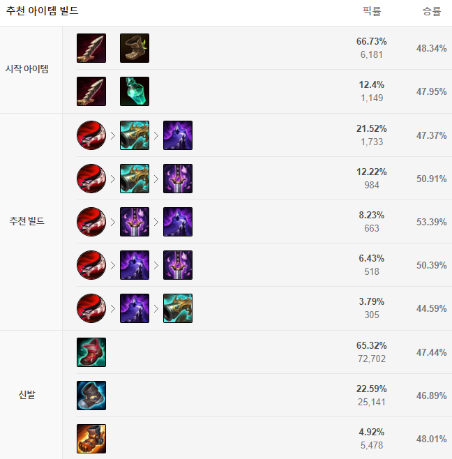 시작은 톱날 단검과 신발로 시작해줍니다. 첫 코어 아이템인 드락사르를 뽑고 두 번째로는 징수의 총을 올려주며 그 이후에는 요우무의 유령검, 밤의 끝자락을 상황에 맞게 순서를 정해 올려주고 그 이후는 보통 방어나 마법저항력 아이템을 가면 좋습니다. 신발의 경우는 첫 번째 코어 아이템이 뜬 뒤 아이오니아 신발을 올려주면 되구요.