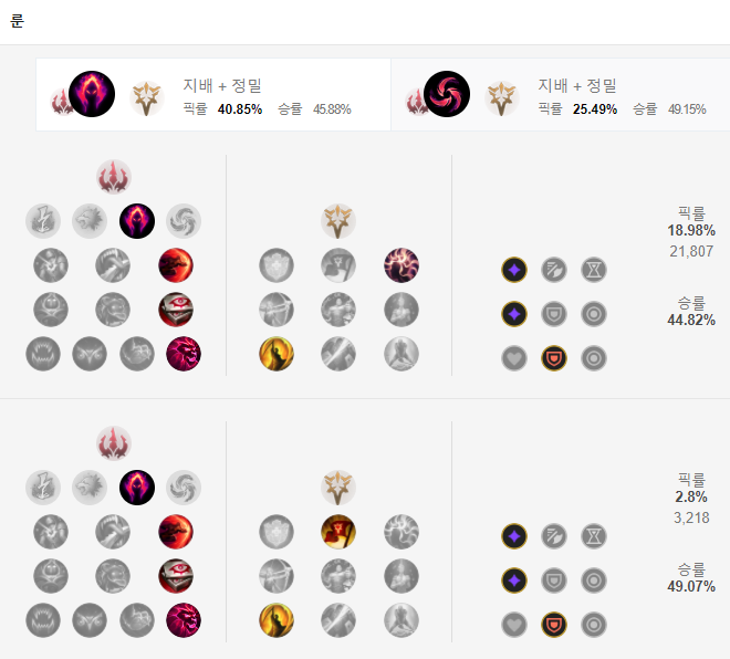 룬은 지배의 어둠의 수확을 핵심 룬으로 사용하고 하위 룬으로는 돌발 일격, 시야 수집, 궁극의 사냥꾼을 들어주며 보조룬으로는 침착과 최후의 일격을 들어주면 됩니다. 어둠의 수확은 후반으로 가면 갈수록 효율이 좋아지고 돌발일격 및 궁극의 사냥꾼은 파이크의 좋은 궁극기를 더 잘 살려주죠. 침착은 마나가 부족한 상황을 어느정도 방지해주며 최후의 일격 역시 궁극기와 잘 맞는 룬입니다.