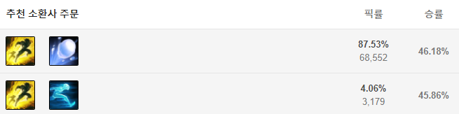 마이는 보통 점멸과 눈덩이를 듭니다. 근접 딜러이기 때문에 눈덩이를 통해 Q 거리를 확보할 수도 있고 눈덩이로 적 챔피언에게 접근해서 E스킬을 쓰고 공격을 하다 적들이 스킬을 퍼부을때 Q로 피하는 방법도 있죠. 눈덩이가 없는 경우 적에게 접근하다가 죽는 일이 굉장히 많기 때문에 가급적 눈덩이를 들어줍시다.