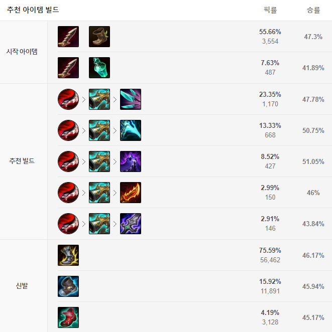보통 드락사르의 황혼검을 올려서 킬이나 어시를 먹고 난 뒤 잠시 은신이 되는걸 이용하여 차례차례 적을 제거합니다. 두 번째 코어 아이템은 징수의 총, 세 번째 코어 아이템은 상황을 보고 적절히 나보리 신속검이나 구인수의 격노검, 정수 약탈자를 추천드립니다. 주의해야 할 점은 나보리 신속검과 구인수의 격노검을 동시에 가는 경우 나보리 신속검의 고유 효과를 못 받기 때문에 두 아이템을 동시에 가는 것은 피해주세요. 또 신발의 경우 첫 번째 코어 아이템과 두 번째 코어 아이템 사이에 광전사의 군화를 올려주면 됩니다.