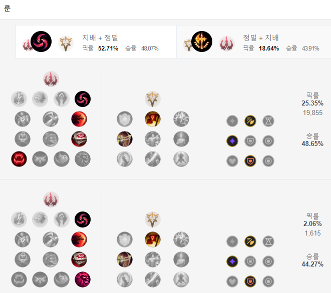 주요 룬은 칼날비를 많이 들어주는데 초반 공격 속도가 느린데다가 첫 코어 아이템 역시 공격 속도를 올려주는 아이템이 아니기 때문에 그런 것들을 칼날비로 어느정도 커버치는 역할입니다. 당연하게도 극후반으로 가면 정복자에 비해 밀리긴 하지만 칼바람 나락 특성상 극후반까지 가는 경우는 드물기 때문에 그냥 맘편하게 칼날비를 들어주면 됩니다. 하위 룬으로는 돌발 일격, 사냥의 증표, 굶주린 사냥꾼을 들어주고 보조 룬으로는 정밀의 승전보와 전설: 민첩함을 들면 됩니다.
