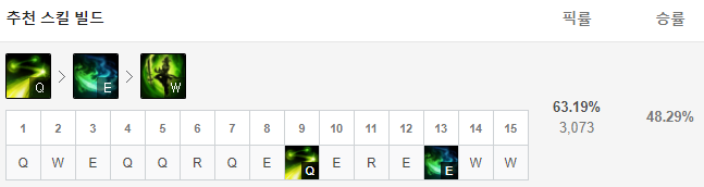 스킬 찍는 순서는 R-Q-E-W 순서입니다. Q스킬은 스킬을 올리면 올릴수록 데미지도 증가하고 쿨타임은 감소합니다. 거기에 적에게 돌입할 수도 있고 또 Q스킬로 상대방의 스킬을 피할수도 있어서 핵심 스킬이기 때문에 먼저 마스터해줍니다.